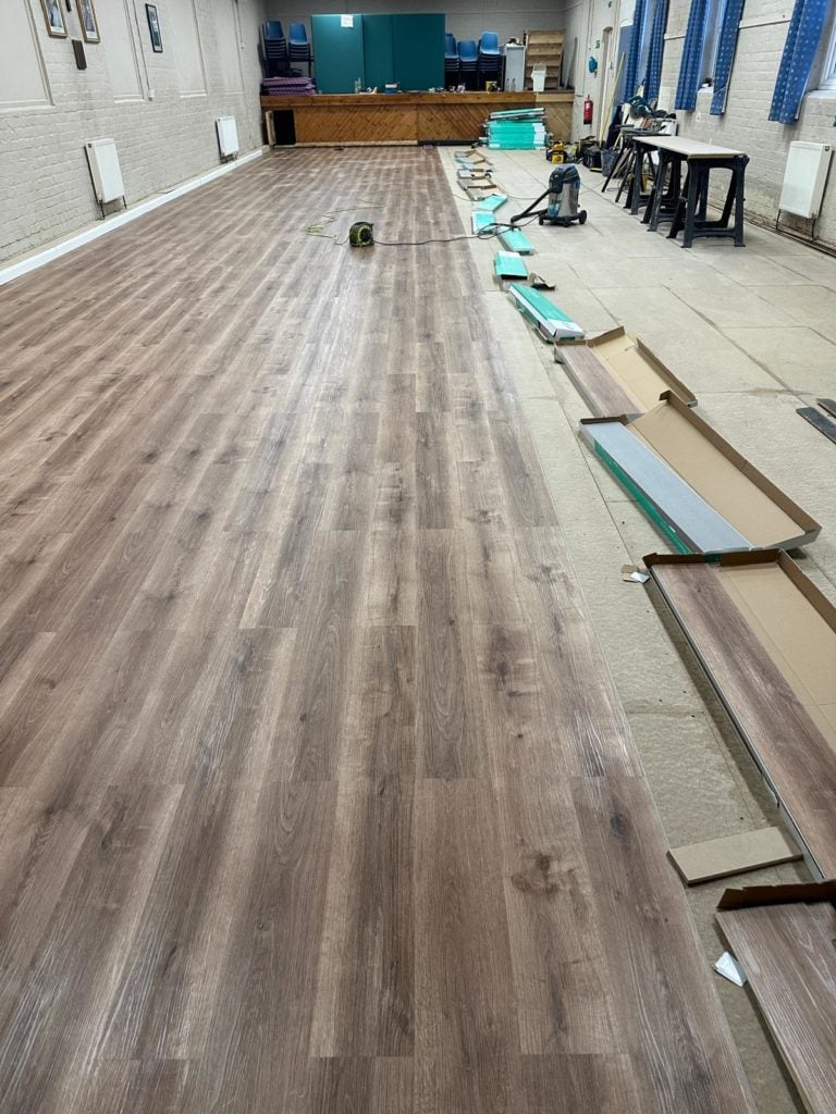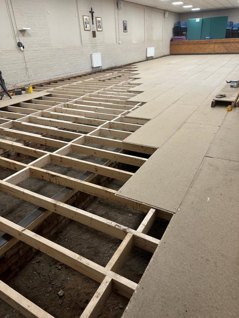 This involved the installation of 186 new floor joists and over 300 meters of joist bearers. We then laid 18mm P5 tongue and groove flooring, followed by a high-quality 6mm luxury vinyl floor covering. To ensure accessibility, we completed the project with skirting and the addition of disabled ramp access at each entry point.